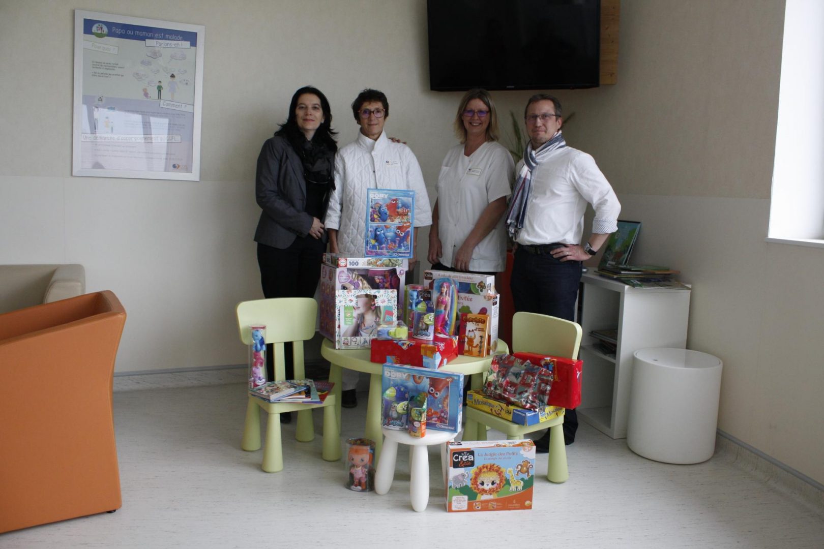 Cet après-midi l’association Happy Dream Child, nous a rendu visite. Emmené par son dynamique Président Stéphane Fichot, accompagné de Critina, les bras chargés de cadeaux pour les enfants et jeunes patients malades. Une chance pour les enfants qui rendaient visites à leur parent malade. Ils pourront ainsi profiter de ces jeux dans les salons « familles ».