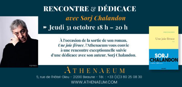 Jeudi 31 octobre à partir de 18h, l’Athenaeum de Beaune accueille Sorj Chalandon, en partenariat avec le CGFL et l’antenne beaunoise de La Ligue contre le cancer.