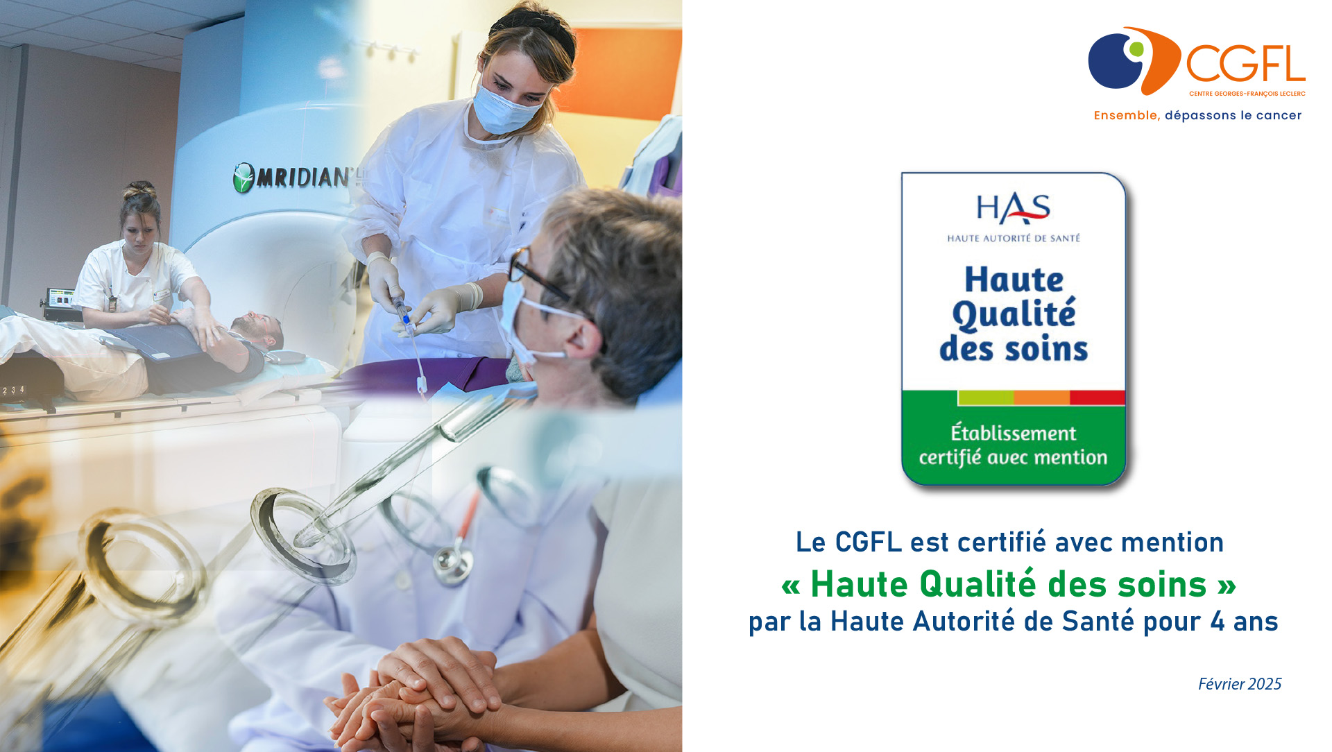 Le Centre de Lutte Contre le Cancer, Georges-François Leclerc vient d’être certifié avec la mention « Haute Qualité des soins » par la Haute Autorité de Santé (HAS), représentant le plus haut niveau de résultat possible pour un établissement de santé.